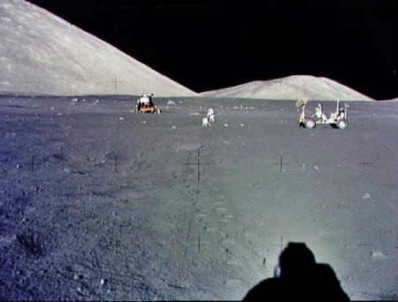 Even in the first "crappy" TV panorama (below - right), those tracks clearly marked the Rabbit's progress... as it ventured farther and farther from the Lander, out across the pristine surface of Mare Imbrium...