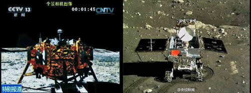 A 2600-lb robotic spacecraft, named "Chang'e-3" (again, after "the Chinese Goddess of the Moon"), for the first time in 37 years (since the Soviet Union's Luna 24, in 1976) touching down in the northern part of Mare Imbrium - carrying, as a bonus, China's first "autonomous lunar rover," a 312-lb, six-wheeled, solar powered vehicle named "Yutu"... Chinese, for Chang'e's famed mythological lunar companion, "Jade Rabbit".