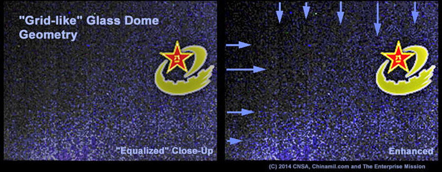 There - from the institution which forms the foundation of China's very 21st Century existence... was the ghostly... repetitive... glistening glass geometry of "an ancient, Mare Imbrium dome..."... with the official "Chinese People's Liberation Army" logo plastered right on top of it (below)!