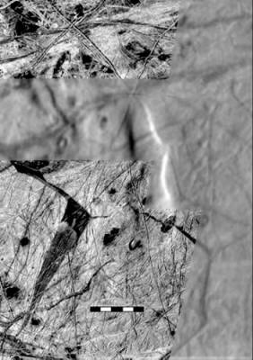 There are chaotic formations (above image) on Europa, as well. All regions on Europa are complexes of parallel and side-by-side grooves with no indications of fracturing.