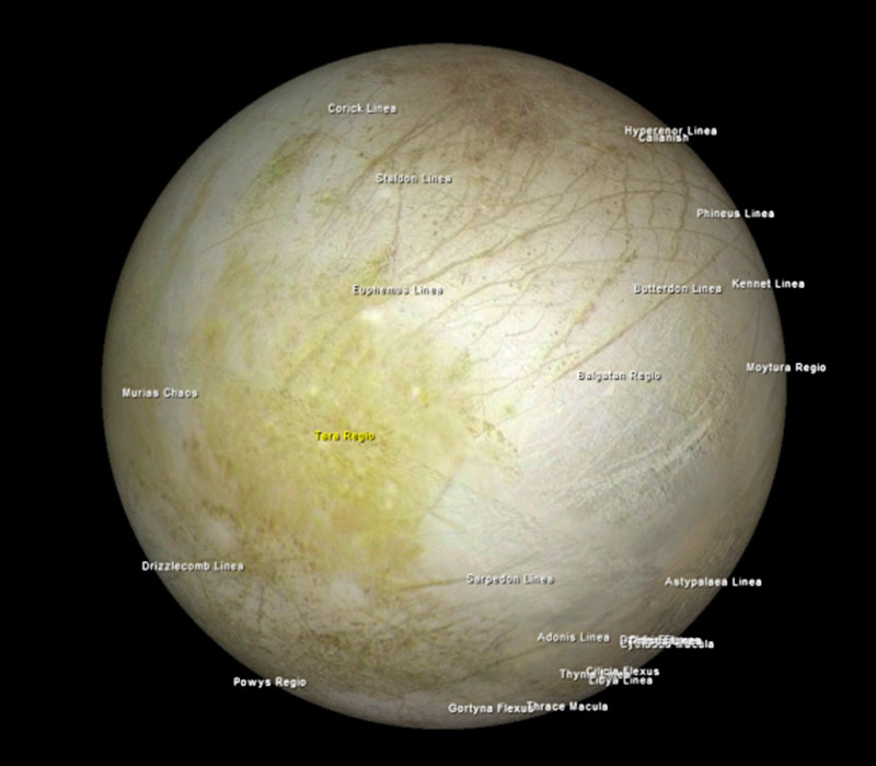 They found signs of sodium chloride turning the surface yellow as it was bombarded with radiation from space. The strongest of these signals came from Tara Regio, a "chaos region" thought to be shaped by water seeping up from the subsurface ocean.