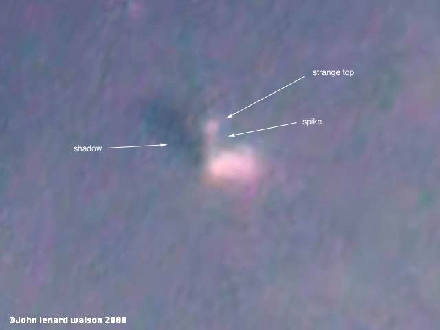 up and out of a deeply-shadowed crater. Is it a tall tower or spire?