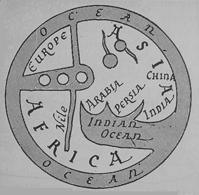 Interpretive drawing of Arabic style medieval maps re-oriented with North at the top (from Raisz)