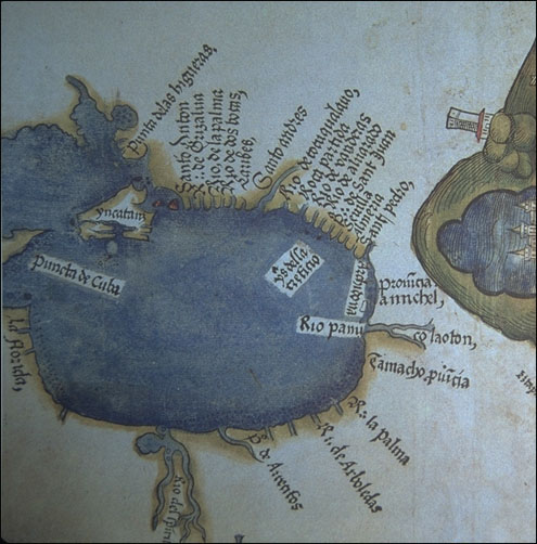 Praeclara Ferdinadi. Cortesii de Noua maris Oceani Hyspania Narratio . . ., detail: Gulf of Mexico, Hernando Cortez, 1524