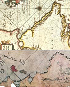 To the right a detail of the mouth of the Strait of Magellan, compared to a detail of Piri Reis map.