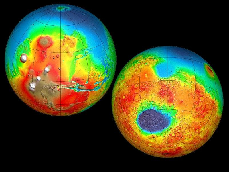 Figure 1 MOLA colorized image of Mars showing the heavily cratered southern highlands (yellow and orange) and the smooth,