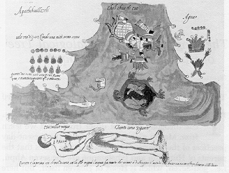 Caprakán is tied up like an animal that is transported home by successful hunters. Then he is placed on the ground where he is buried according to the rules of primeval interment (horizontal position). And with his burial ends the era of the giants, the close of the first ethnical cycle of American prehistory. A painting in the Vatican A Codex illustrates the destruction of the First Age by a giant interred in a horizontal position under the surface of the earth.