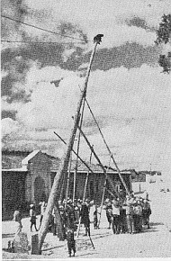 Figure 12. Raising the Flying Pole in Chichicastenango. The "monkey" climbs higher as the pole is raised (Courtesy of Ovidio Rodas Corzo).