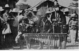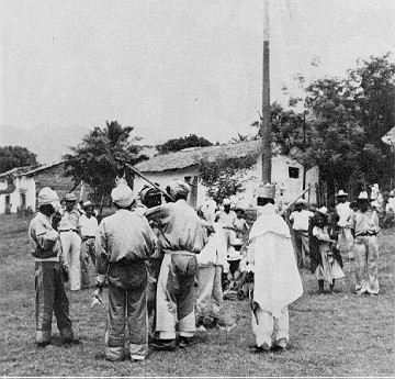 Figure 29. Scene of the dismemberment. As the Popol Vuh says: they cut him into pieces and tore out his heart and, holding it aloft, showed it to the Lords. In the Chortí drama a handkerchief represents the heart that is displayed to the sun. Another actor cuts off the legs, arms, and so on, in succession.