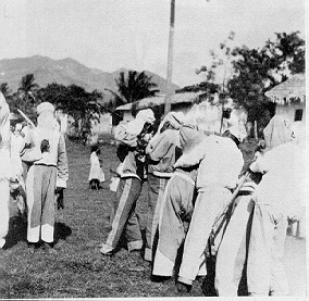 Figure 24a. In the Dance of the Giants: 1. Glyph on cap of master of ceremonies. 2. Figure on trouser cuffs of Giants. 3. Shaft of Black Giant's headdress. 4. Insignia of Gavite. 5. Captain's sleeve adornment. 6. Shoulder insignia. 7. Collar spangles.