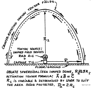 This protective force field dome, which is an oblate spheroid (egg-shaped) , is activated through the employment of a protocol implemented through the focused consciousness of the user, using a very simple tensor formula, properly visualized, and directed with will, accompanied by a specific breathing pattern.