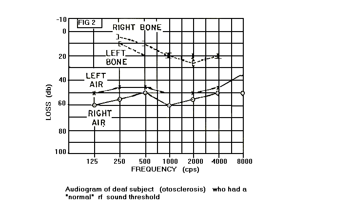 At one time in our experimentation with deaf subjects, there seemed to be a clear relationship between the ability to hear audio above 5Kc and the ability to hear rf sounds. If a subject could hear above 5Kc, either by bone or air conduction, then he could hear the rf sounds. For example, the threshold of a subject whose audio-gram appears in Fig. 2 was the same average power density as our normal subjects. Recently, however, we have found people with a notch around 5Kc who do not perceive the rf sound generated by at least one of our transmitters.