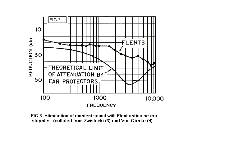 In order to minimize the rf energy used in the experimentation, subjects wore Flent antinoise ear stoppers whenever measurements were made. The Ordinary noise attenuation of the Flents is indicated in Fig. 3. Although the rf sounds can be heard without the use of Flents, even above an ambient noise level of 90 db, it appears that the ambient noise to some extent "masked" the rf sound.