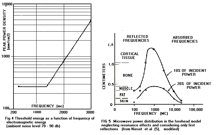The energy from transmitter H was not perceived, even when the peak power density was as high as 25 w/cm2. When the threshold energy is plotted as a function of the rf energy (Fig 4), a curve is obtained which is suggestive of the curve of penetration of rf energy into the head. Figure 5 shows the calculated penetration, by frequency of rf energy, into the head. Our data indicate that the calculated penetration curve may well be accurate at the higher frequencies but the penetration at the lower frequencies may be grater than that calculated on this model.
