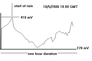 The figure left shows the voltage obtained with a 10 cm square of metal foil in contact with a wall at the height of 6 meters. The readings clearly show the approach of the storm and the point at which rain began to fall.