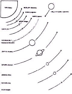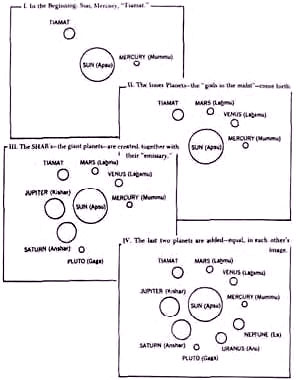 The Sun (APSU in the Sumerian texts, meaning "One Who Exists from the Beginning"), its little companion MUM. MU ("One Who Was Born," our Mercury) and farther away TI.AMAT ("Maiden of Life") were the first members of the Solar System; it gradually expanded by the "birth" of three planetary pairs, the planets we call Venus and Mars between Mummu and Tiamat, the giant pair Jupiter and Saturn (to use their modern names) beyond Tiamat, and Uranus and Neptune farther out (Fig. 8).
