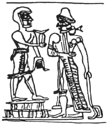 Al llegar a Babilonia, «en el Esagil, el templo del Cielo y la Tierra, entró y se presentó ante Marduk». Los antiguos artistas recogieron tan trascendental encuentro (Fig. 81); en él, se representa a ambos dioses aferrados a sus armas, pero Marduk, con casco, de pie en una plataforma, ofrece una especie de símbolo de bienvenida a su hermano.