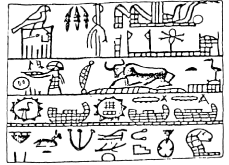 It begins with a crouching Horus-symbol which gazes toward the Land of the Date Palm where an unusual vessel with dredges or cranes (?) is situated, as well as a structure which is reminiscent of the Sumerian depiction of the name EN.LIL as a communications center (Fig. 52). A God greeting the Pharaoh, a bull and the Bird of Immortality are seen, followed by fortifications and an assortment of symbols. Finally, the symbol for "place" (tilted cross within a circle) appears between the sign for the Stairway and a sphinx looking the other way!