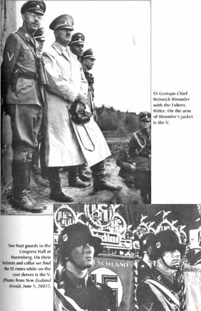 Sir Winston Churchill, a crypto Jew, a Mason, a Druid witch, and war-time Prime Minister of Great Britain, flashes his famous "V" sign. Long used to represent a number of occultic tasks, including Divine Man, sexual license, and fire, Churchill's frequent use spurred the use of the device by an uninformed populace as a sign of victory.