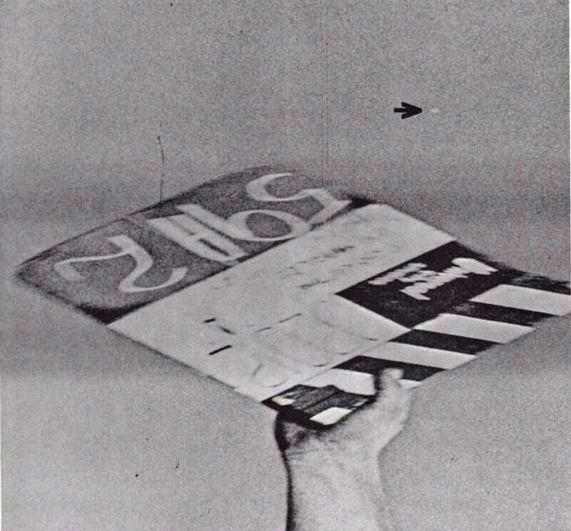 The Sonora, California, UFO. Arrow shows small, bright source which drifts toward top of frame on motion picture footage.