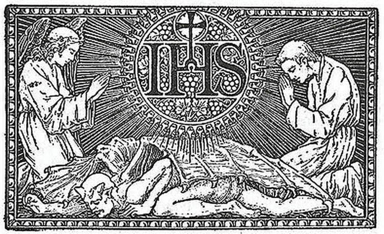 Here we see what looks like an angel and a monk either side of the fallen Satan. What are they doing? Are they worshiping the sun or the Fallen One? Does the female angel represent the Sisterhood?