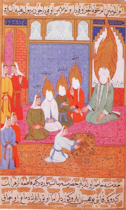 and hints of his features are visible. a Turkish religious biography of Mohammed completed in 1388 and later lavishly illustrated with 814 miniatures under the reign of Ottoman ruler Murad III, being completed in 1595. Many of the miniatures depict Mohammed, and this particular one shows Ali bin Abu Taleb beheading Nasr bin al-Hareth