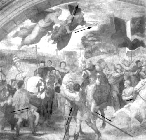 A portrait of Pope Leo’s meeting with the Huns by Raphael Loggias also illustrates the location of the “Shield of Christ.” The sword held by St. Peter points to the winter solstice.
