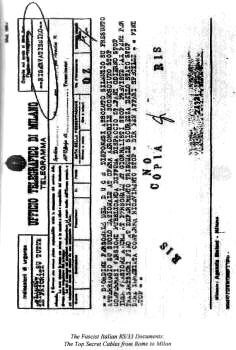 E. An Unlikely Source: Benito Mussolini's Secret RS/33 UFO- Marconi Study Group: The Original Italian "MJ-12" Documents But how could Dr. Wernher von Braun, Paperclip rocket "specialist", speaking in the early 1970s, be so exactingly prescient in his prediction of the exact sequence of "enemies"? One answer, that of the "Torbitt" document, is of course that he himself was a senior "insider", privy to the plots and canards of the innermost conspiracies driving western politics and culture. However, another source of material has emerged only recently that might afford a clue as to how long UFOs have been being secretly studied and attempts made to back engineer them for some time. In the year 2000, very secret papers from the archives of the Italian government were deliberately leaked to Italian UFOfologists. Unlike the MJ-12 documents, however, these documents were not films, nor photocopies, but the actual handwritten notes and original files and telegrams, on original paper, with original ink. This allowed documents experts from the University of Bologna to do an exhaustive analysis of the paper and inks and style of writing of the telegrams. The conclusion? The documents were undoubtedly authentic. The story they contained was nothing less than explosive, for they told how, in response to various UFO sightings in the north of Fascist Italy in 1933, and Italian Air Force scrambles to intercept the intruders, that Benito Mussolini had established the first state level black projects UFO study group, under the direction of the famous Italian physicist and inventor Marconi. The group, like a much later American project, assembles reports, photographs, witness testimonies, and developed a classification system for various types of sightings. The group was classified at the highest level by Mussolini. When Fascist Italy and Nazi Germany concluded the Rome-Berlin Axis, Mussolini transferred, often literally shipping this treasure trove of information to Nazi Germany, where it most likely made its way eventually into the hands of the SS. In any case, On February 23, 1941, as the war clouds between the Axis and the United States were growing darker, Mussolini made one of his characteristically blunt statements. He said,