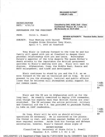 In it, Powell tells Bush that Blair 'will be with us' on military