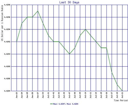 In the wake of the July 17 crash in Ukraine, the Russian ruble has continued to decline (see chart below).