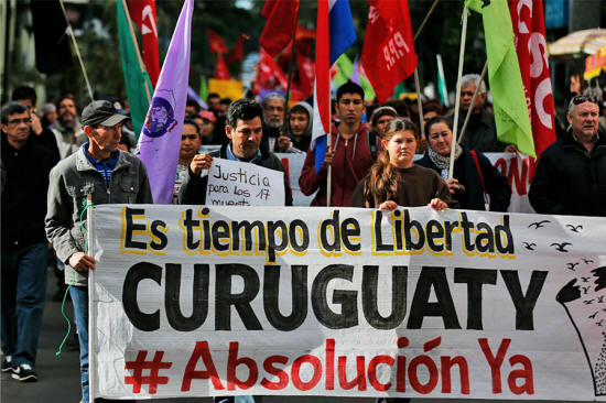 Supporters of the relatives of 11 farmers killed in a shootout with police in the town of Curuguaty march to demand justice. Asuncion, Paraguay, July 6, 2016 (AP photo by Jorge Saenz).