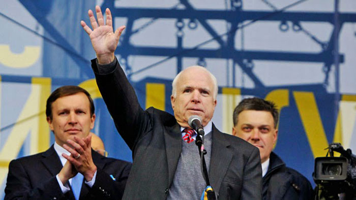 John McCain on stage in Kiev, Ukraine cheerleading U.S.