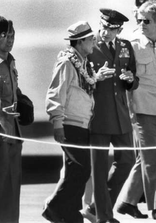 (AFP PHOTO/Robyn Beck) having secreted a vast fortune in foreign bank accounts before fleeing into exile in 1986, arrives at Hickam Air Force Base in Honolulu.