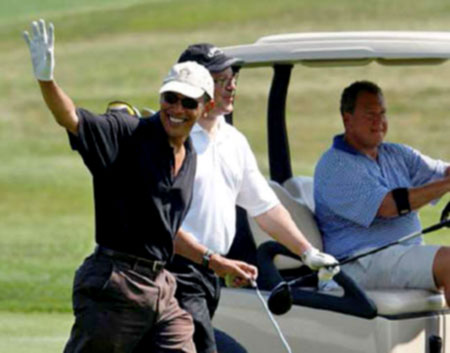 fundraiser Robert Wolf is driving the golf cart. Last August, the presidential press corps followed Barack Obama and his family to Martha's Vineyard for their brief vacation.