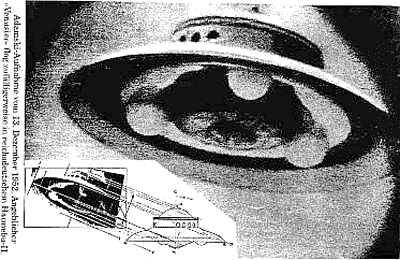 These photos were taken in the 1970’s by a night watchman in West Germany. A very good dossier of photos and films exists on the flying machines mentioned above, as for example the 60 minute documentation " UFO Secrets of the Third Reich" (MGA Austria/Royal Atlantis Film GmbH). Likewise the dossier of the American Vladimir Terziski who, during the UFO conference in September 1991 in Phoenix Arizona showed slides for three hours and showed photos of German saucers, drawings of their construction, and of subterranean German bases.