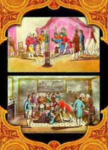 Other scenes of rituals in 18th-century Masonic lodges. The initiation ceremony of a new member.The secrecy oath, taken under the threat of the sword