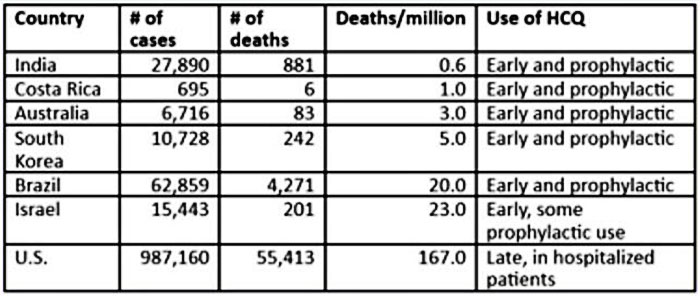 En un cuadro preparado por la Asociación Americana de Médicos y Cirujanos (más abajo) se observa que en los Estados Unidos se producen casi 30 veces más muertes per cápita que en los países que hacen uso temprano y profiláctico de la hidroxicloroquina.