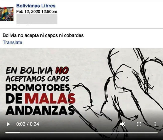 The Bolivia pages spread Spanish-language propaganda promoting coup leader Jeanine Áñez, a right-wing extremist from a fringe party that got just 4 percent of the vote in the November election but who was recognized by the United States as the country's supposed interim president.