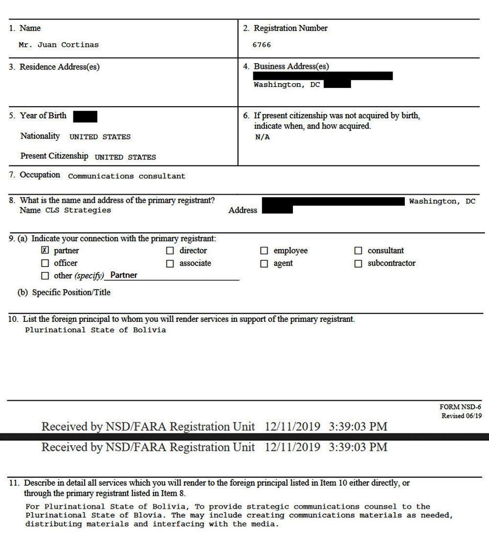 Almost exactly a month later, on December 11, 2019, CLS Strategies registered under the US Foreign Agents Registration Act (FARA) as a lobbyist for the Bolivian coup regime.