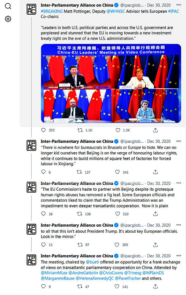 The signing created a storm of controversy in Washington, with Deputy National Security Advisor Matthew Pottinger descending into a tirade, accusing the EU of disregarding the interests of the US on the eve of a new administration.