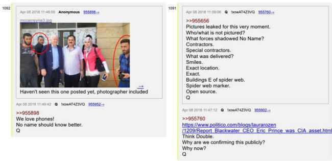 QAnon publicó fotos que muestran a McCain con las fuerzas de oposición sirias asociadas con el Estado Islámico, y sugirió que la visita de McCain fue una cubierta para entregar algo que ayudaría a la agenda del Estado Profundo: supuestamente uranio del mismo lote vendido a Rusia.