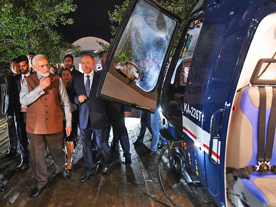 and Russian President Vladimir Putin review a Kamov KA-226T helicopter painted in Indian Army colors at the Eastern Economic Forum in Vladivostok, Russia on Wednesday.