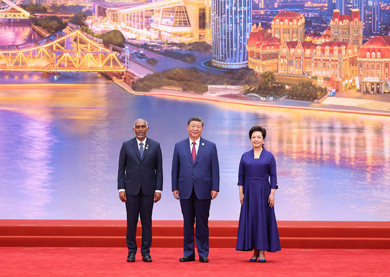 wife, Peng Liyuan, pose for a group photo with Maldivian