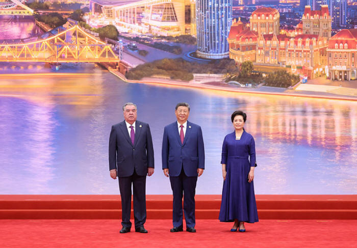 wife, Peng Liyuan, pose for a group photo with Tajik