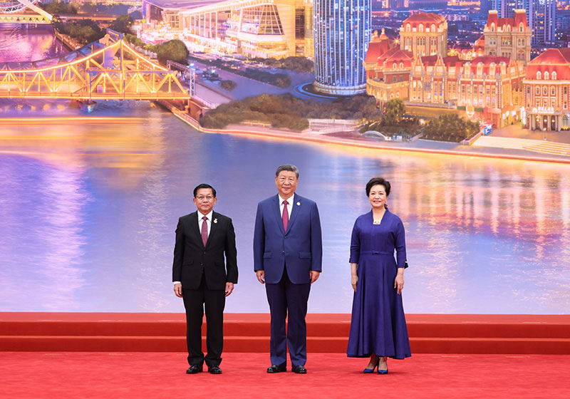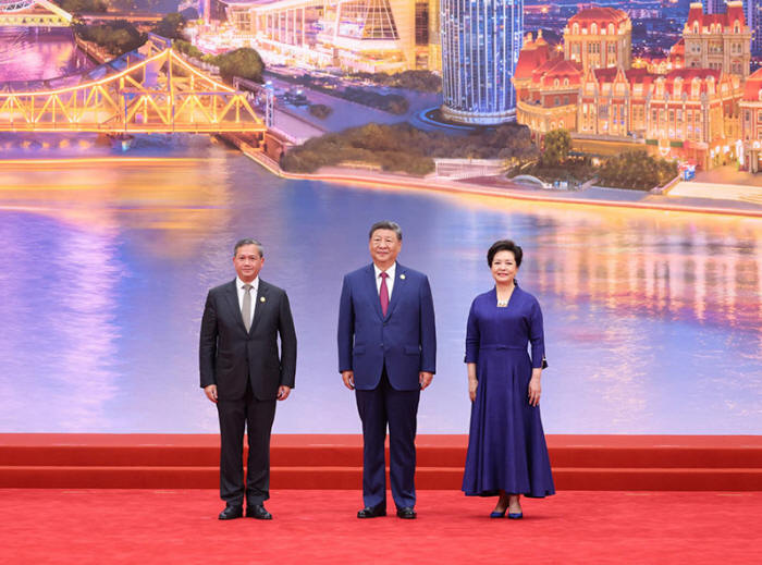 wife, Peng Liyuan, pose for a group photo with Cambodian