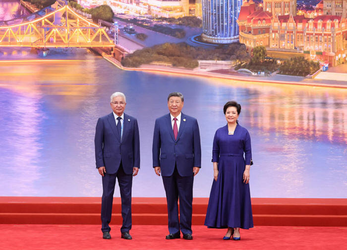 wife, Peng Liyuan, pose for a group photo with Turkmen