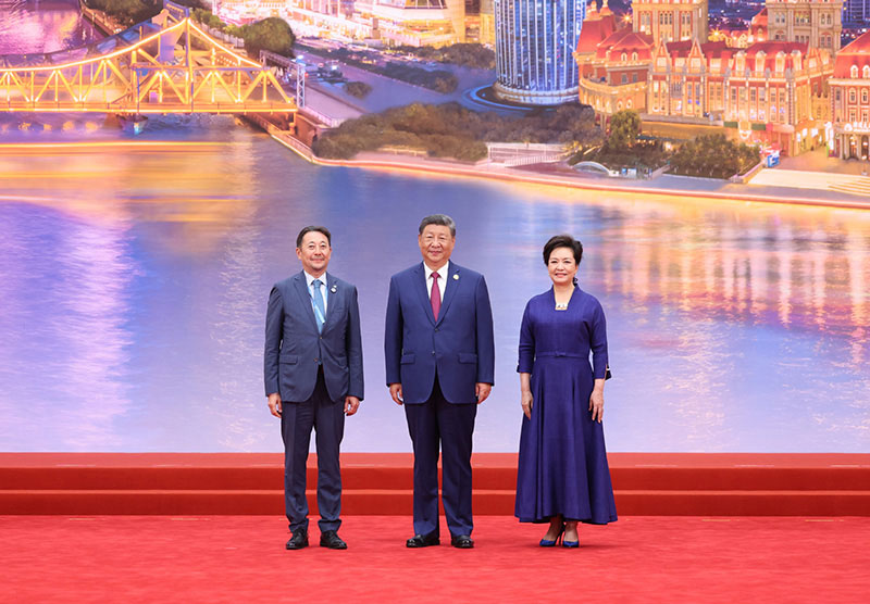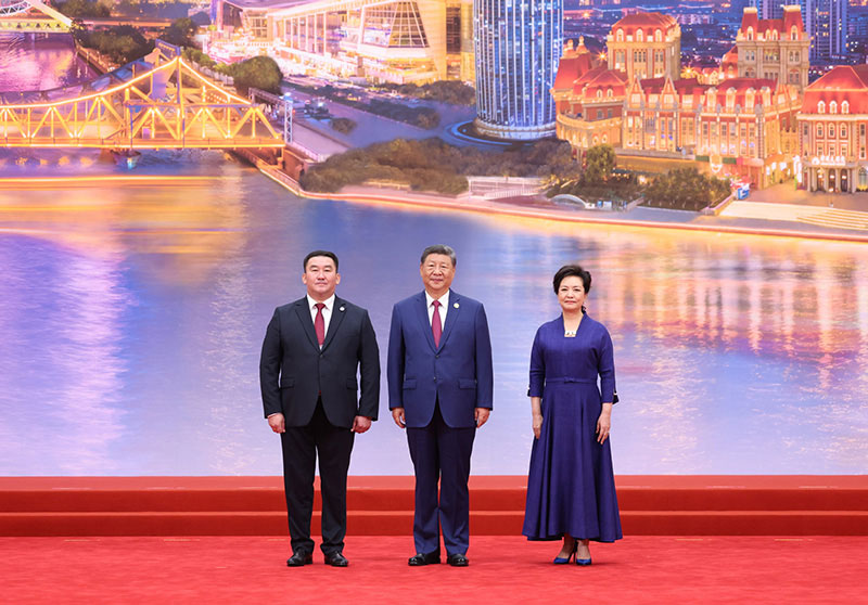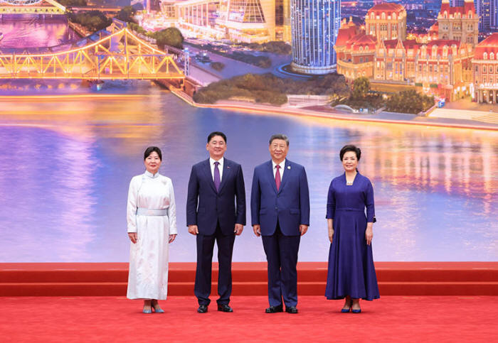 wife, Peng Liyuan, pose for a group photo with Mongolian