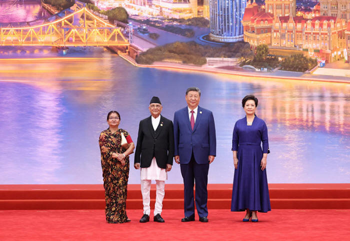 wife, Peng Liyuan, pose for a group photo with Nepali