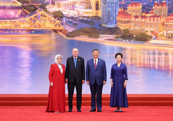 wife, Peng Liyuan, pose for a group photo with Turkish