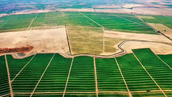 es un mosaico de campos verdes, atravesados por sistemas de riego